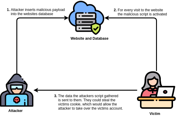 Stored XSS can be used to steal a victims cookie (data on a machine that authenticates a user to a webserver). This can be done by having a victims browser parse the following Javascript code:
