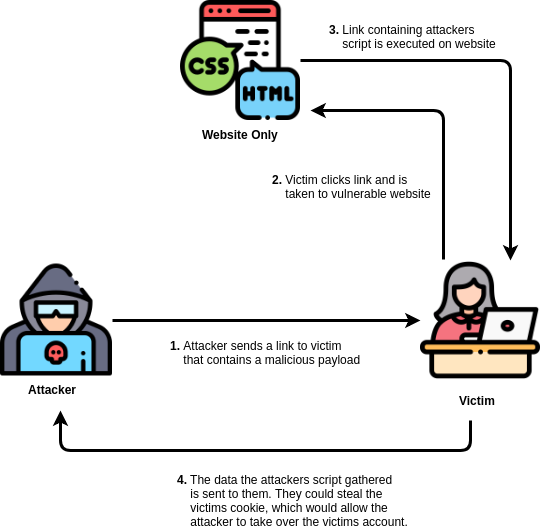 In a reflected cross-site scripting attack, the malicious payload is part of the victims request to the website. The website includes this payload in response back to the user. To summarise, an attacker needs to trick a victim into clicking a URL to execute their malicious payload.