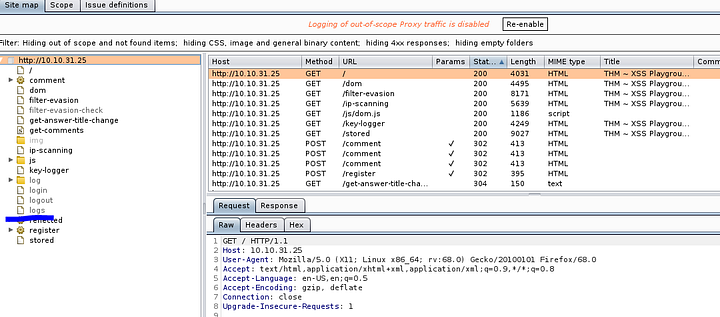 Burp Suite’s sitemap to log site.