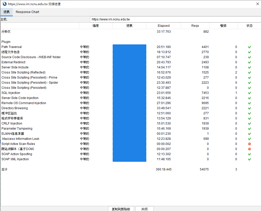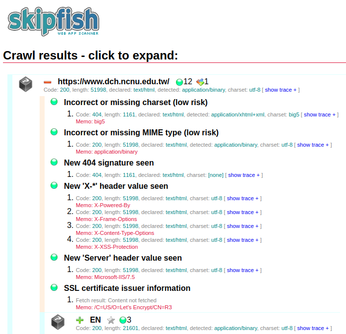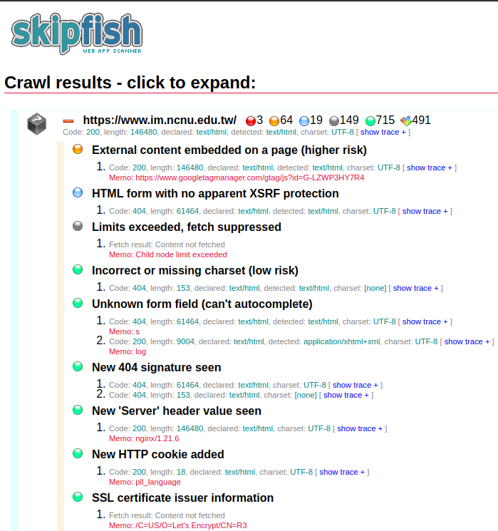 | Skipfish | 程式有檢測到可能存在的漏洞,但排查後應並無漏洞。 | 程式有檢測到可能存在的漏洞,但排查後應並無漏洞。 | 完美通過測試 |