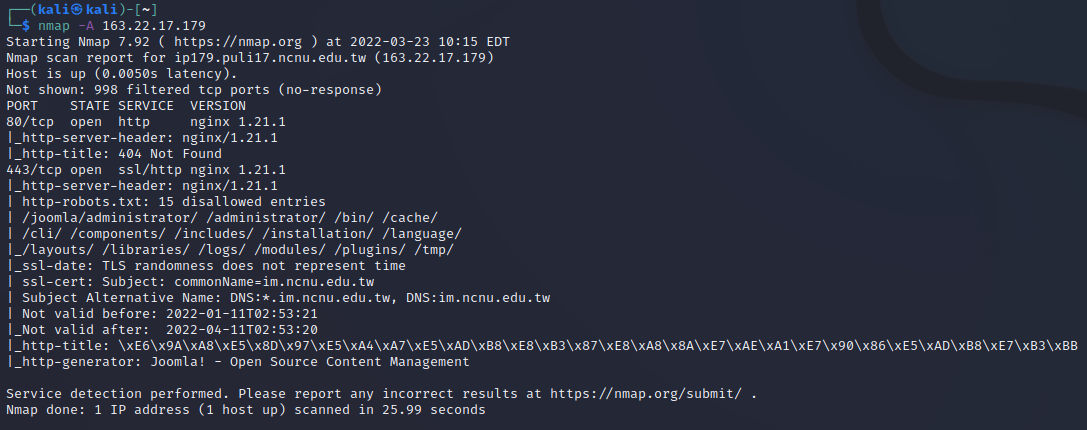 ┌──(kali㉿kali)-[~] └─$ sudo nmap -sV -p 22,80,443 www.econ.ncnu.edu.tw Starting Nmap 7.92 ( https://nmap.org ) at 2022-06-11 05:39 EDT Nmap scan report for www.econ.ncnu.edu.tw (163.22.17.239) Host is up (0.020s latency). Other addresses for www.econ.ncnu.edu.tw (not scanned): 2001:e10:6840:17::239 PORT STATE SERVICE VERSION 22/tcp open ssh OpenSSH 7.2p2 Ubuntu 4ubuntu2.10 (Ubuntu Linux; protocol 2.0) 80/tcp open http nginx 1.10.3 (Ubuntu) 443/tcp open ssl/http nginx 1.10.3 (Ubuntu) Service Info: OS: Linux; CPE: cpe:/o:linux:linux_kernel Service detection performed. Please report any incorrect results at https://nmap.org/submit/ . Nmap done: 1 IP address (1 host up) scanned in 13.66 seconds- 資訊 : 22 (OpenSSH 7.2p2 Ubuntu 4ubuntu2.10 (Ubuntu Linux; protocol 2.0))、 80 (nginx 1.10.3 (Ubuntu)) 、 443 (nginx 1.10.3 (Ubuntu)) port 開啟