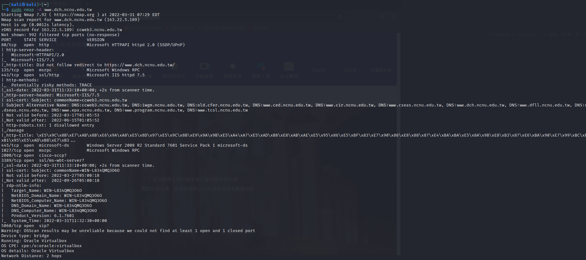 - 資訊 : 80 (IIS/7.5)、 135 (Microsoft Windows RPC) 、 443 (Microsoft IIS httpd 7.5)、 445 (Windows Server 2008 R2) 、 1027 (Microsoft Windows RPC) 、2000 (cisco-sccp?) 、3389 (ssl/ms-wbt-server?)、5060(sip?) 在 oracle virtualbox 上執行