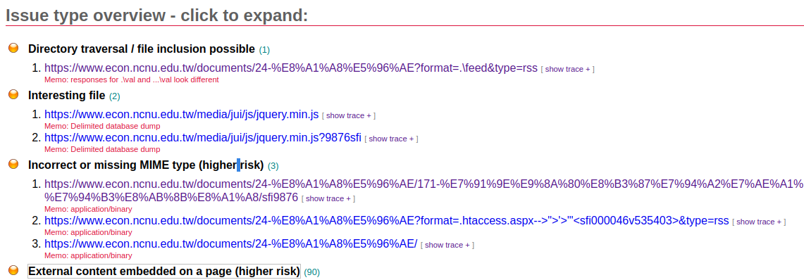 | Nikto | 程式有檢測到可能存在的漏洞,但排查後應並無漏洞。 | 程式有檢測到可能存在的漏洞,但應都已修復 | 程式有檢測到可能存在的漏洞,但排查後應並無漏洞。 |