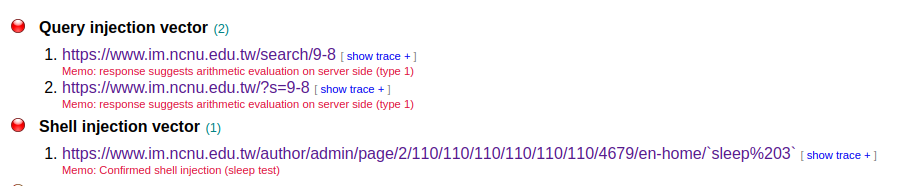 - 資訊 : 可能存在 reflected XSS 、 SQL Injection 漏洞