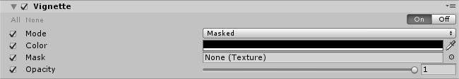 Masked mode multiplies a custom texture mask over the screen to create a Vignette effect. This mode can be used to achieve less common or irregular vignetting effects.