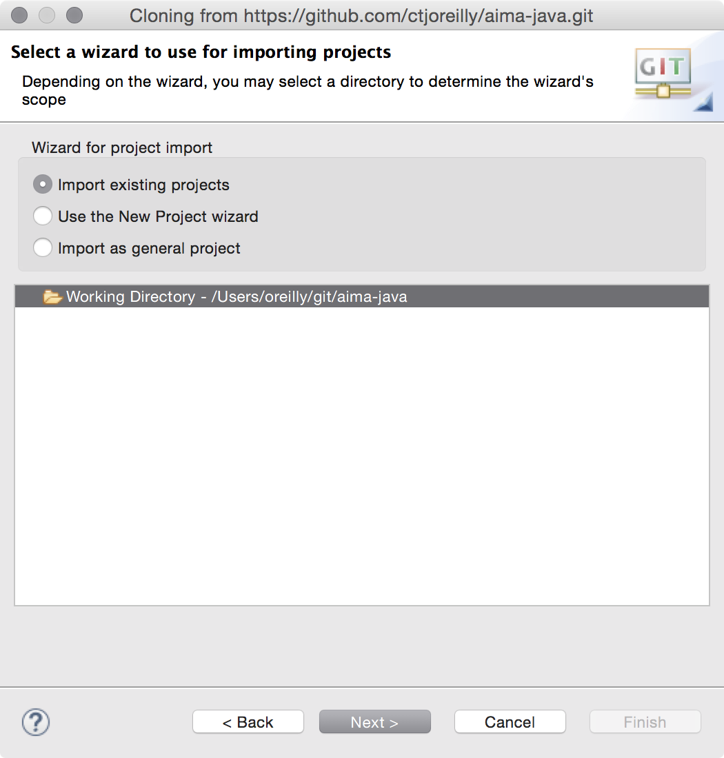 Source Git Repositorydialog enter the URIhttps://github.com/aimacode/aima-java.gitfor the project and your own GitHubUser:name andPassword::