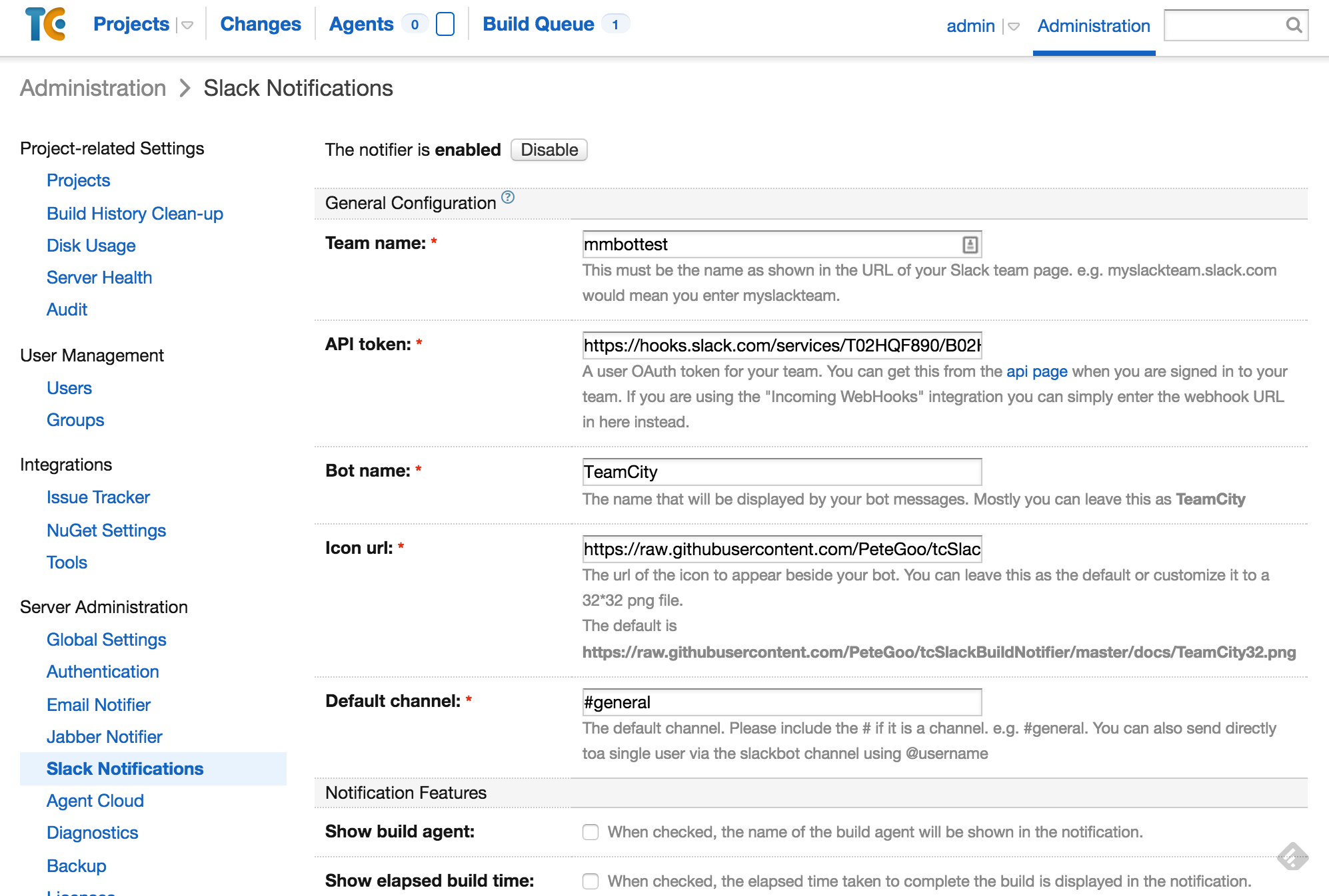 Head over to the releases section and get the zip labelled tcSlackNotifierPlugin.zip from there (do not download the one on this page). Copy the zip file into your team city plugins directory