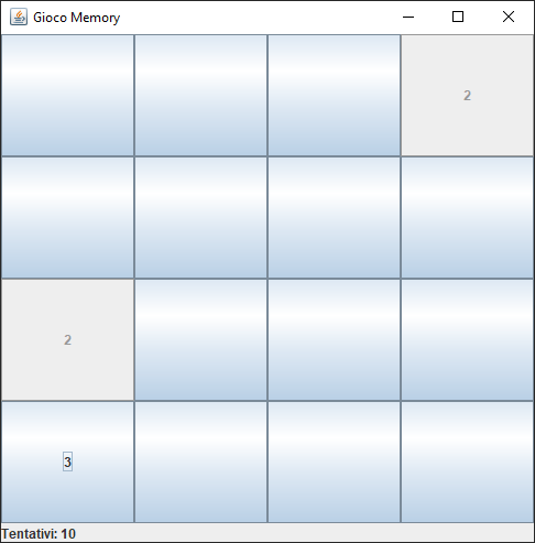 Gioco del memory in Java Swing con contatore dei tentativi, cambiare il numero di carte è semplice dato che è semplicemente una variabile nel codice. In futuro potrebbe essere aggiunto un menu di impostazioni con la possibilità di selezionare il numero delle carte e i tentativi massimi per il gioco. Altre funzioni da aggiungere potrebbero essere un tasto di Reset o un cronometro che mostra il tempo di gioco.