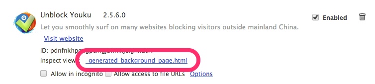 - 之后 Unblock Youku 扩展旁边多出来一个叫 _generated_background_page.html 的链接,点它会打开另外一个窗口